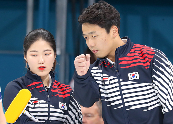 대한민국 컬링 대표팀 장혜지와 이기정이 8일 오전 강릉컬링센터에서 열린 2018 평창올림픽 컬링 믹스더블 예선 1차전 핀란드와의 경기에서 대화를 나누고 있다.