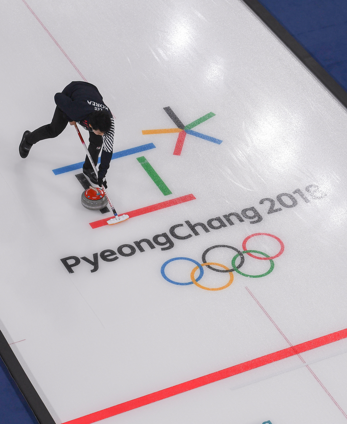 대한민국 컬링 대표팀 이기정 8일 오전 강릉컬링센터에서 열린 2018 평창올림픽 컬링 믹스더블 예선 1차전 핀란드와의 경기에서 브룸으로 스위핑하고 있다.