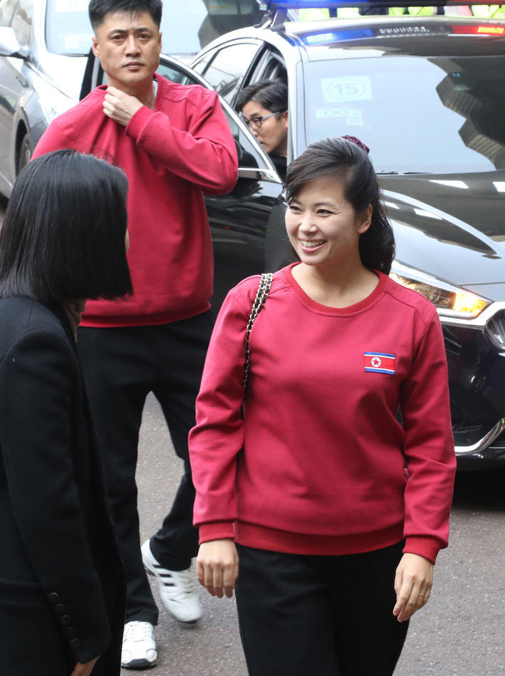 현송월 북한 삼지연관현악단장이 서울 공연을 하루 앞둔 10일 오후 리허설을 위해 서울 국립극장으로 들어서며 관계자와 인사하고 있다.