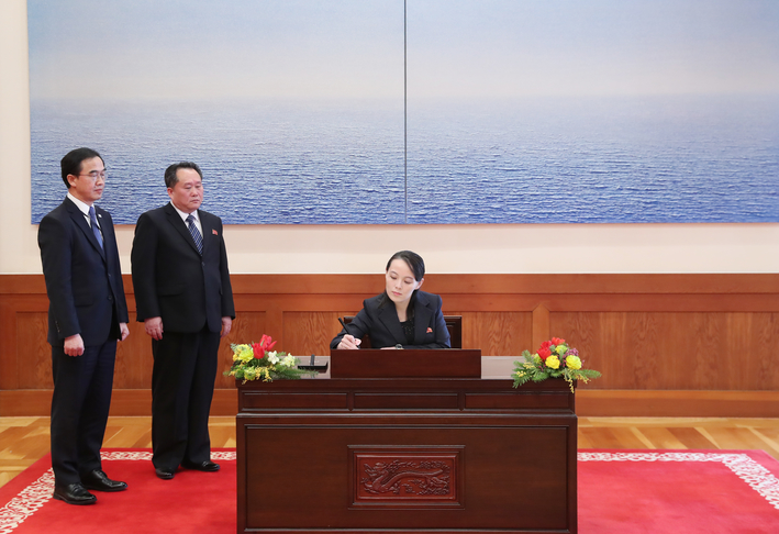 문재인 대통령 초청으로 청와대를 방문한 김정은 북한 노동당 위원장의 여동생 김여정 노동당 중앙위 제1부부장이 10일 오전 청와대 본관에서 방명록을 작성하고 있다.