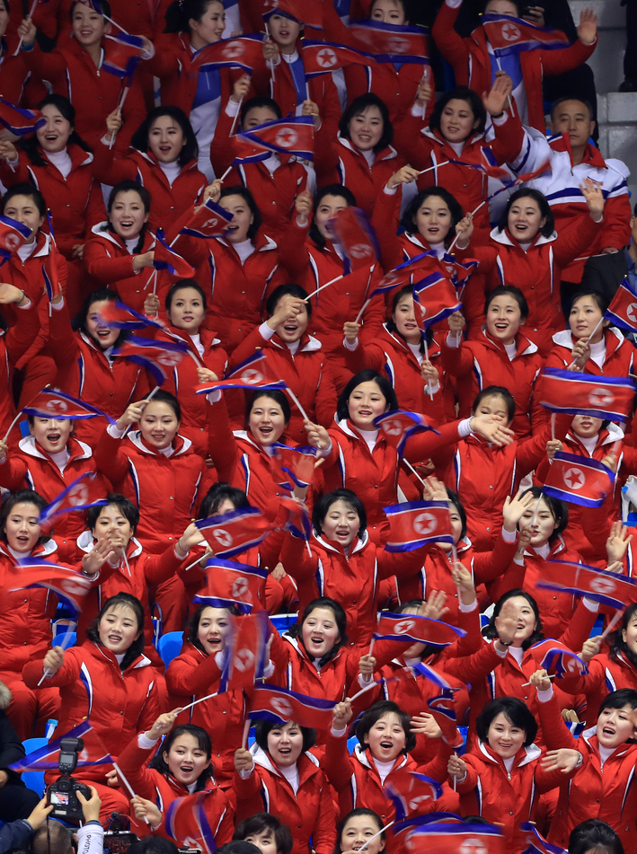 10일 오후 강원도 강릉아이스아레나에서 열린 평창동계올림픽 쇼트트랙 예선 경기에서 북측 응원단이 응원을 펼치고 있다.