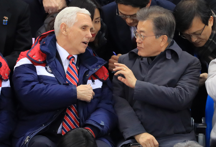 문재인 대통령이 10일 2018 평창동계올림픽 쇼트트랙 남자, 여자 예선전이 열리는 강릉 아이스아레나를 찾아 미국 펜스 대통령과 대화를 나누고 있다.