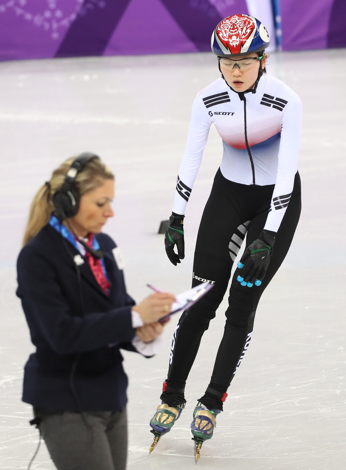 국가대표 심석희가 10일 오후 강릉 아이스아레나에서 열린 2018 평창동계올림픽 쇼트트랙 여자 500m 예선에서 3위로 레이스를 마친 뒤 아쉬워하고 있다.