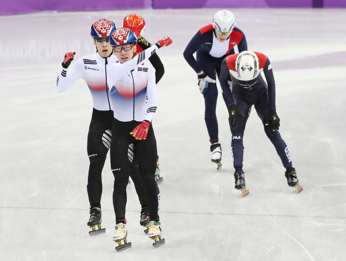 국가대표 임효준(189)과 황대헌(58)이 10일 오후 강릉 아이스아레나에서 열린 2018 평창동계올림픽 쇼트트랙 남자 3,000m 준결승에서 나란히 레이스를 펼치고 있다.