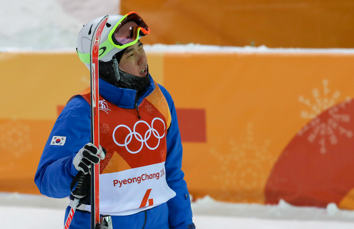 국가대표 최재우가 12일 오후 강원도 평창군 휘닉스 경기장에서 열린 평창동계올림픽 프리스타일 스키 남자 모굴 결선 2라운드에서 경기 후 점수를 확인하고 있다.