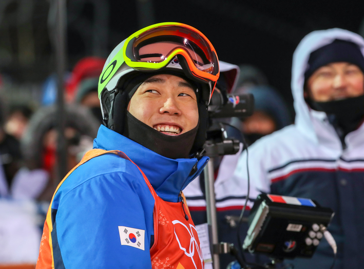 국가대표 최재우가 12일 오후 강원도 평창군 휘닉스 경기장에서 열린 평창동계올림픽 프리스타일 스키 남자 모굴 결선 1라운드에서 2라운드 진출을 확정되자 웃고 있다.