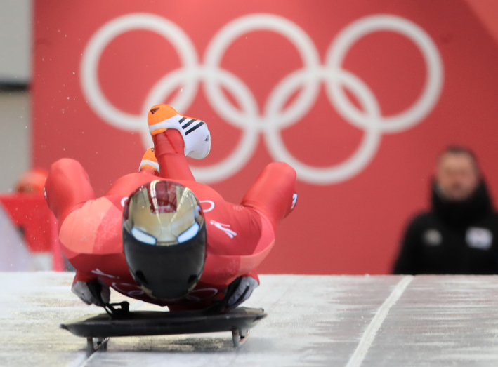 국가대표 윤성빈이 15일 강원도 평창군 슬라이딩센터에서 열린 남자 스켈레톤 1차 경기에서 레이스를 펼치고 있다.