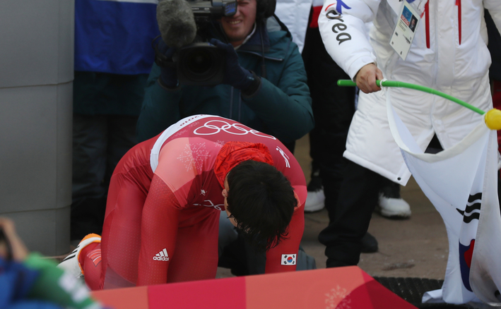 국가대표 윤성빈이 16일 강원도 평창군 슬라이딩센터에서 열린 남자 스켈레톤 4차 경기에서 금메달을 확정지은 뒤 큰 절하고 있다.