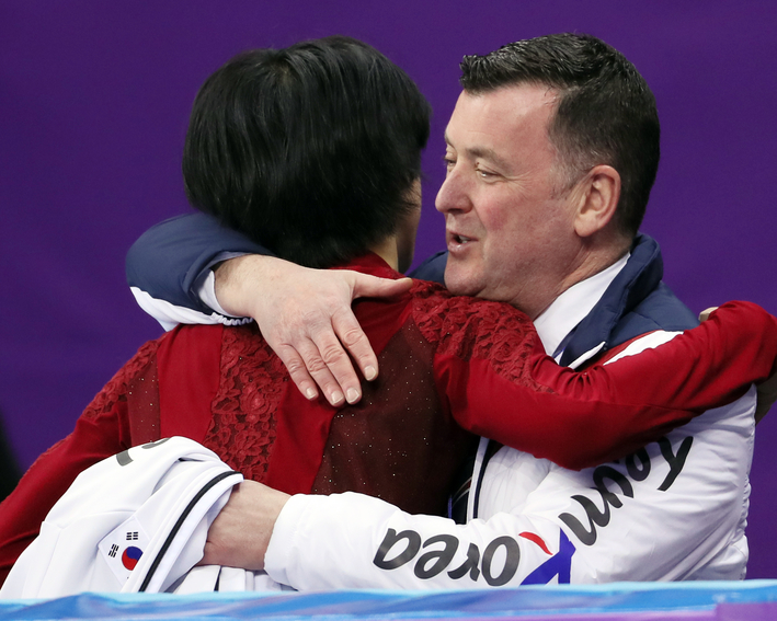 국가대표 차준환이 16일 강릉아이스아레나에서 열린 2018 평창동계올림픽 피겨스케이팅 남자 싱글 쇼트 프로그램에서 연기를 마치고 브라이언 오서 코치와 포옹하고 있다.