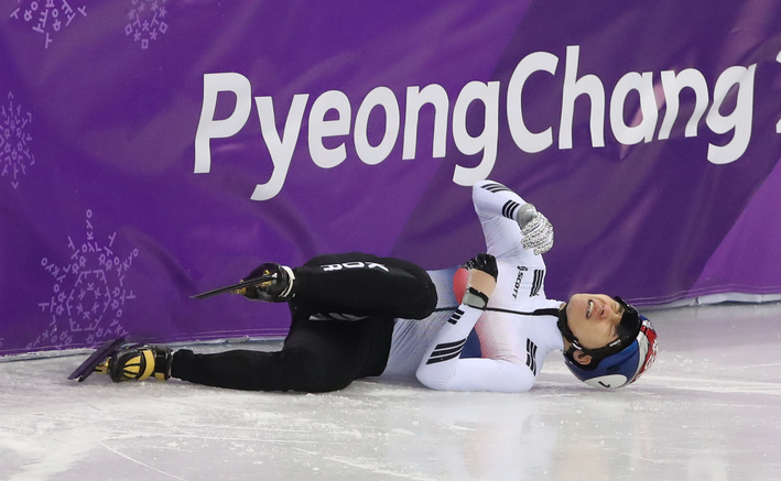 국가대표 서이라가 22일 강릉 아이스아레나에서 열린 2018 평창동계올림픽 쇼트트랙 남자 500m 준준결승에서 중국 한톈위와 엉켜 넘어진 후 괴로워하고 있다.