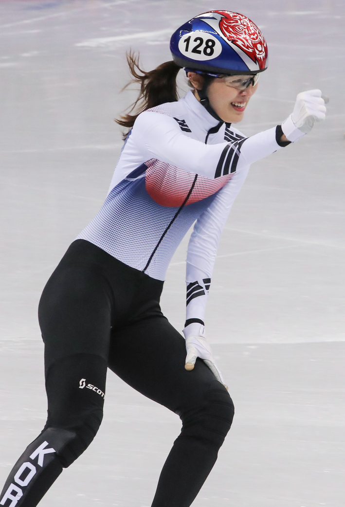 국가대표 김아랑이 22일 강릉 아이스아레나에서 열린 2018 평창동계올림픽 쇼트트랙 여자 1,000m 준준결승에서 준결승 진출을 확정지은 뒤 기뻐하고 있다.