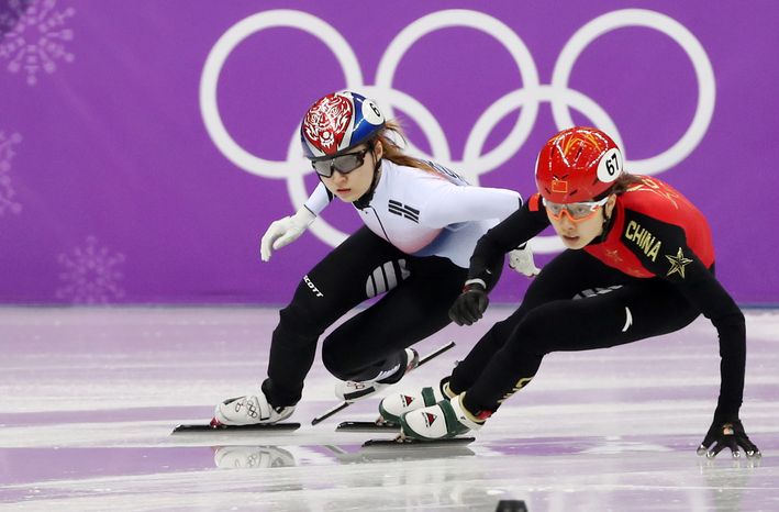 국가대표 최민정이 22일 강릉 아이스아레나에서 열린 2018 평창동계올림픽 쇼트트랙 여자 1,000m 준준결승에서 레이스를 펼치고 있다.