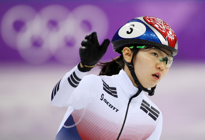 국가대표 심석희가 22일 강릉 아이스아레나에서 열린 2018 평창동계올림픽 쇼트트랙 여자 1,000m 준준결승에서 레이스를 펼치고 있다.