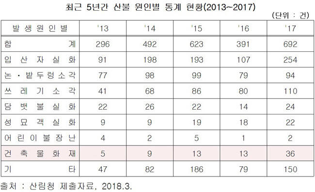 13일 국회 재난안전대책특별위원회 소속 자유한국당 송석준 의원에 산림청이 제출한 자료에 따르면, 2013년 5건에 불과했던 건축물 화재로 인한 산불은 2014년 9건, 2015년 13건, 2016년 13건으로 증가했고, 특히 지난해에만 36건에 달해 최근 5년간 7배 이상 증가한 것으로 나타났다.