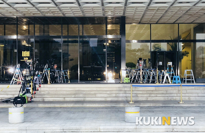 14일 오전 서울 서초구 서울중앙지방검찰청에서 취재진이 이명박 전 대통령 검찰 소환을 취재하기 위해 기다리고 있다.