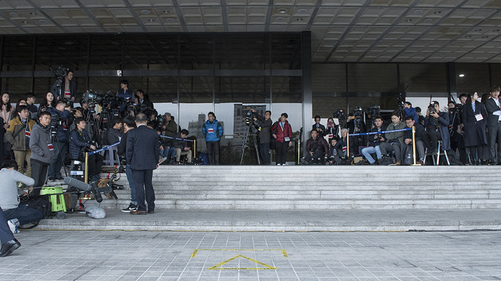 14일 오전 서울 서초구 서울중앙지방검찰청에서 취재진이 이명박 전 대통령 검찰 소환을 취재하기 위해 기다리고 있다.