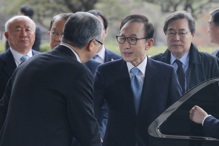 뇌물수수·횡령·조세포탈 등 혐의를 받는 이명박 전 대통령이 14일 오전 서울 서초구 서울중앙지검에 피의자 신분으로 출석해 검찰 관계자와 악수하고 있다.