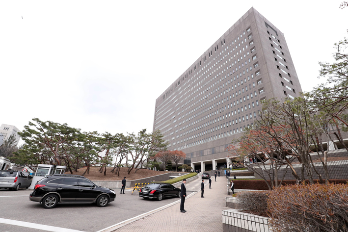 이명박 전 대통령이 탑승한 차가 14일 오전 서울 서초구 서울중앙지검에 진입하고 있다.