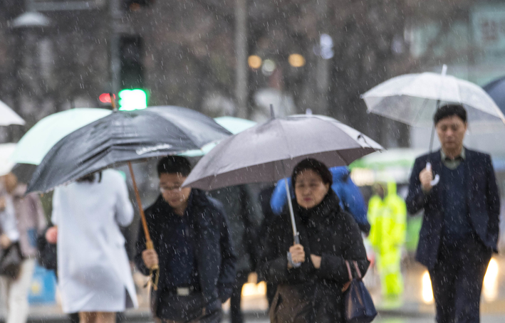 봄비가 내리는 15일 오전 서울 세종로사거리에서 시민들이 우산을 쓴 채 걷고 있다.