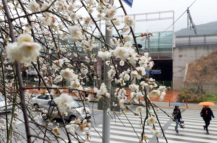 봄비가 내린 15일 부산 해운대구 센텀시티에서 시민들이 우산을 쓴 채 걷고 있다.