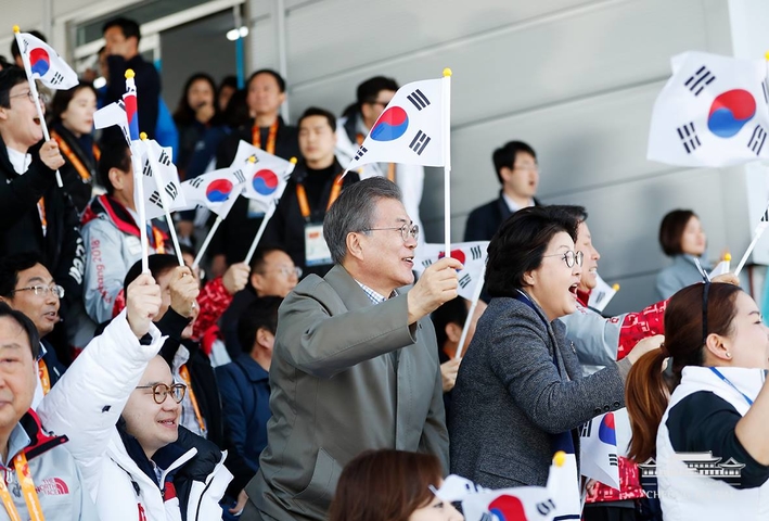 문재인 대통령과 김정숙 여사가 14일 강원도 평창 바이애슬론센터에서 열린 2018 평창패럴림픽 크로스컨트리 예선 경기를 관람하며 응원하고 있다.