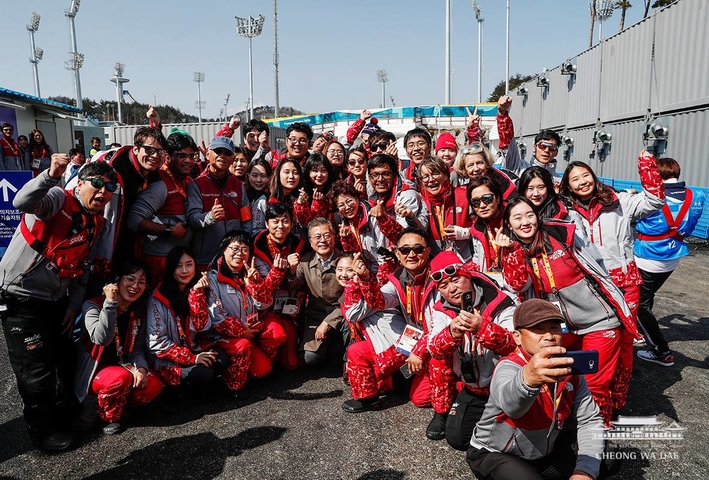 문재인 대통령이 14일 강원도 평창 바이애슬론센터에서 열린 2018 평창패럴림픽 크로스컨트리 예선 경기를 관람하고 자원봉사자들과 포즈를 취하고 있다.