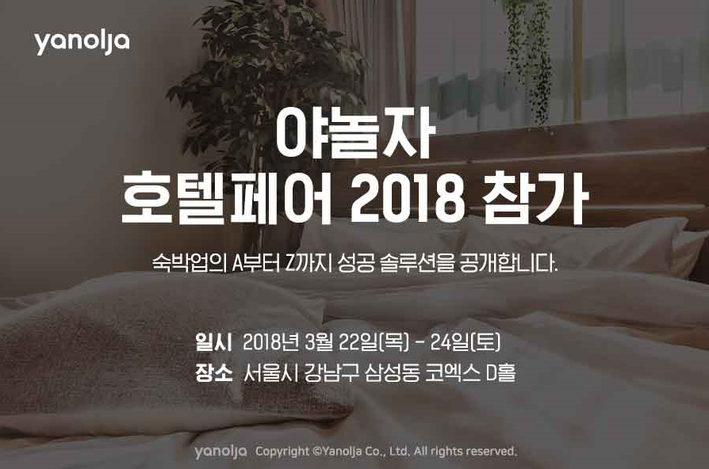 야놀자는 오는 22일부터 24일까지 서울 강남구 삼성동 코엑스에서 개최되는 호텔페어 2018에 참가한다고 19일 밝혔다.