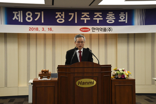 한미약품은 이날 주총에서 작년 매출 9166억원, 영업이익 822억원, 순이익 690억원 달성과 1707억원 연구개발(R&D) 투자 등 2017년 주요 경영실적을 보고했다. 이어 임종윤 사장의 사내이사 재선임 및 이사 보수한도 안건을 각각 의결했다.