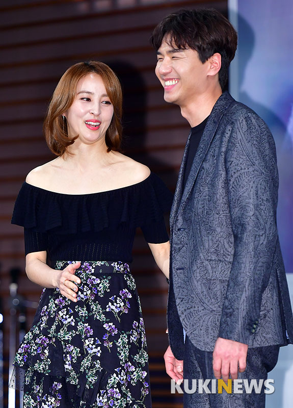 배우 한혜진과 김태훈이 20일 오후 서울 상암동 MBC 골든마우스홀에서 열린 수목드라마 '손 꼭 잡고, 지는 석양을 바라보자' 제작발표회에서 포즈를 취하고 있다.