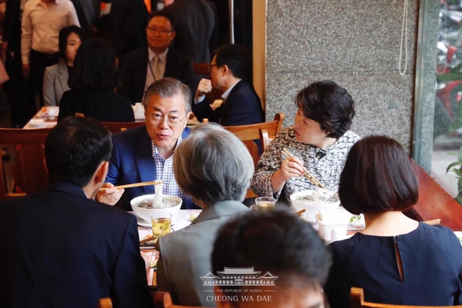베트남을 국빈 방문중인 문재인 대통령과 김정숙 여사가 24일 베트남 3대 쌀국수집 중의 하나인 포10리쿠옥쓰 식당을 찾아 강경화 장관, 베트남 이혁 대사 내외와 함께 아침 식사를 하고 있다.