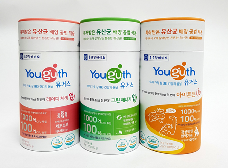 유거스(Youguth)는 You(당신), Gut(장), Youth(젊음)의 단어를 조합해 ‘당신의 장을 젊게 만든다’는 메시지를 담은 브랜드다. 성인용 ‘그린에너지업’, 여성용 ‘레이디챠밍업’, 어린이용 ‘아이튼튼업’ 3종으로 구성돼 연령대별·성별로 맞춤형 성분을 강화했다.