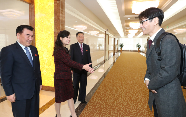 남북평화 협력기원 남측예술단예술감독을 맡은 가수 윤상이 31일 오후 평양순안국제공항에 도착, 현송월 삼지연관현악단 단장의 환영을 받고 있다.