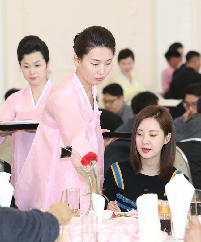 2일 오후 평양 냉면 전문점인 옥류관에서 남북평화 협력기원 남측예술단원인 가수 서현이 냉면을 먹고 있다.