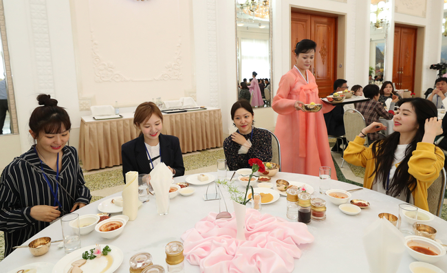 2일 오후 평양 냉면 전문점인 옥류관에서 남북평화 협력기원 남측예술단원인 걸그룹 레드벨벳이 냉면을 먹고 있다.