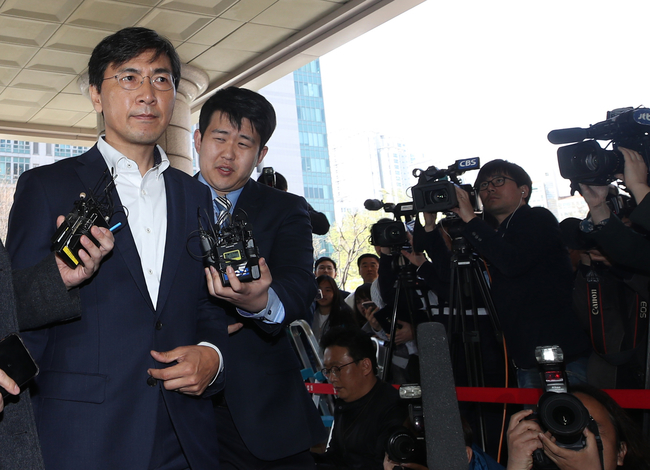 성폭력 의혹을 받는 안희정 전 충남지사가 4일 오후 서울 마포구 서울서부지법에서 열린 두 번째 구속 전 피의자심문(영장실질심사)에 출석해 취재진의 질문을 받고 있다.