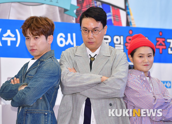 개그맨 유세윤과 김신영, 가수 이상민(사진 왼쪽부터)이 11일 오후 서울 상암동 스탠포드 호텔에서 열린 MBC에브리원 '주간 아이돌'(연출 김동호) 기자간담회에 참석해 포토타임을 갖고 있다.