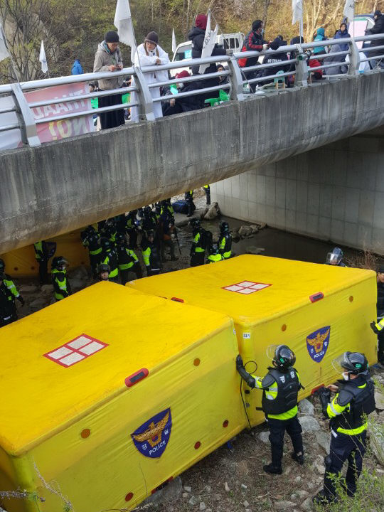 12일 오전 경북 성주군 초전면 진밭교에서 사드 반대 단체 회원과 경찰이 대치하고 있다. 경찰이 사고에 대비해 에어매트를 설치하고 있다.