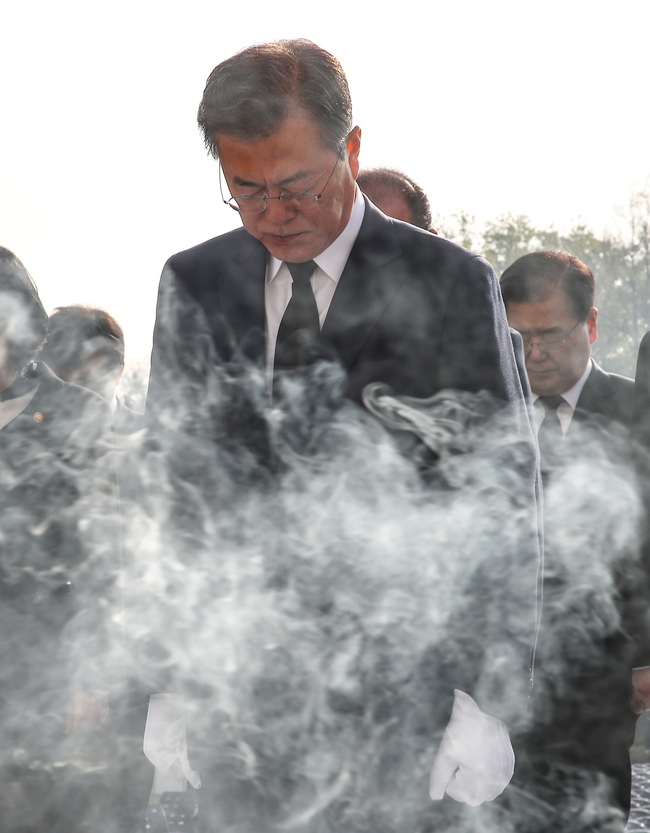 문재인 대통령이 19일 오전 서울 국립 4.19민주묘지를 방문해 묵념하고 있다.