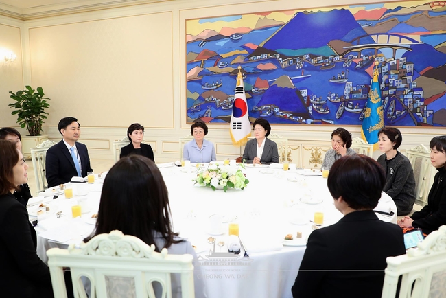 김정숙 여사가 23일 오후 청와대 본관 인왕실에서 임무수행 중 순직한 공군조종사 유가족 초청 오찬을 갖고 유가족들을 위로하고 있다.