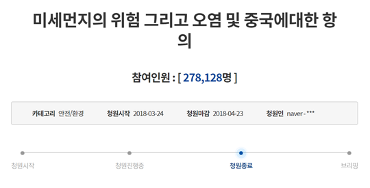 지난 3월 24일 청와대 청원에는 ‘미세먼지의 위험 그리고 오염 및 중국에 대한 항의’란 제목의 청원이 올라왔다. 해당 청원은 한 달 동안 총 27만8128명이 참여, 뜨거운 반응을 이끌어냈다. 이는 최근 문제가 되고 있는 미세먼지에 직접적인 피해를 입은 시민들의 분노에 기인한다.