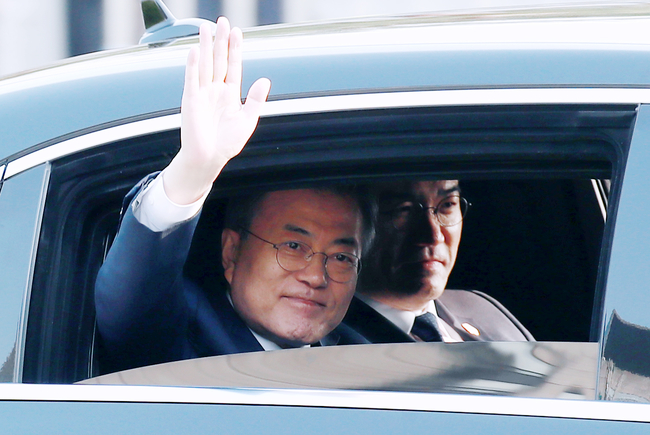 문재인 대통령이 27일 오전 서울 광화문 정부서울청사 앞을 지나 회담이 열리는 판문점으로 향하며 시민들에게 인사하고 있다.