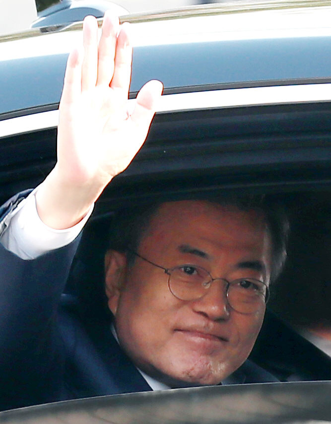 문재인 대통령이 27일 오전 서울 광화문 정부서울청사 앞을 지나 회담이 열리는 판문점으로 향하며 시민들에게 인사하고 있다.
