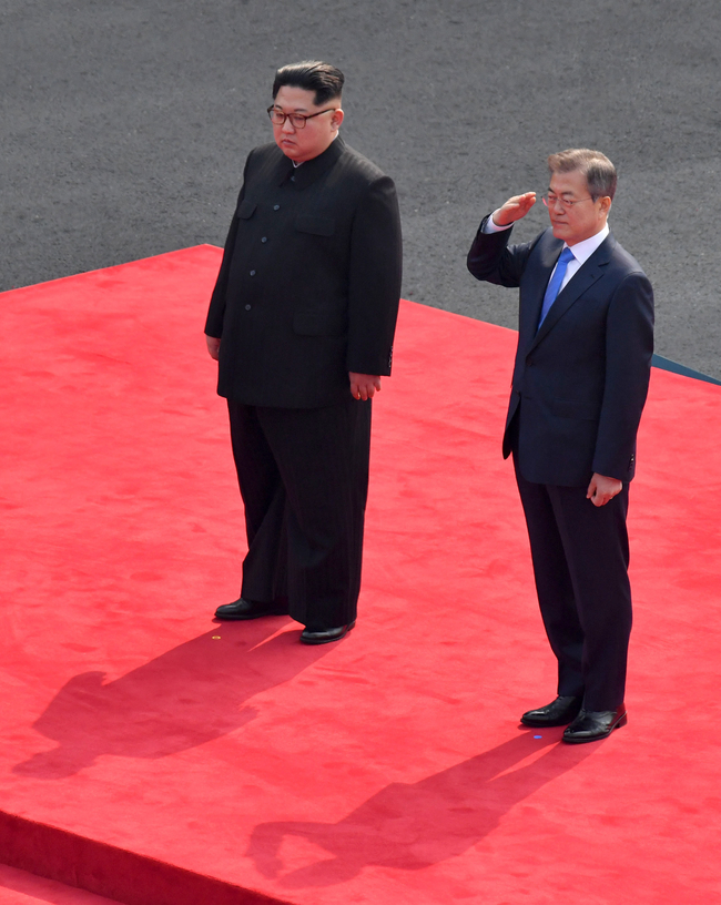 문재인 대통령과 김정은 국무위원장이 27일 판문점에서 공식환영식에서 사열을 받고 있다.
