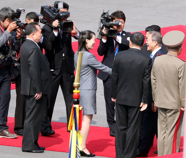 문재인 대통령이 27일 판문점에서 김정은 북한 국무위원장의 공식환영식을 마치고 김여정 북한 당중앙위원회 제1부부장과 인사하고 있다.