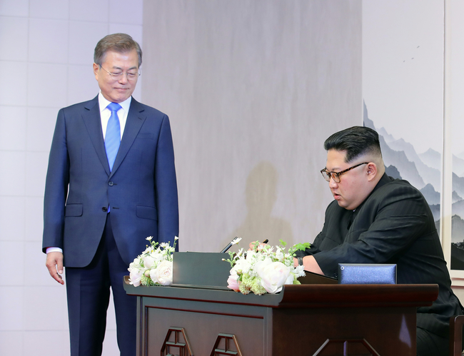 문재인 대통령이 27일 오전 파주시 판문점 평화의 집에서 남북정상회담에 앞서 방명록을 쓰고 있는 북한 김정은 국무위원장을 보고 있다.