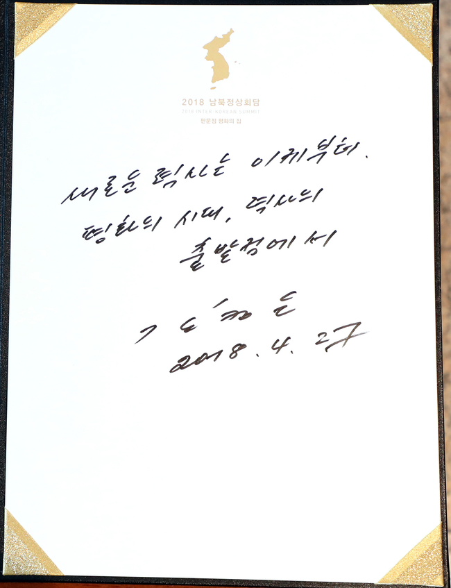 2018남북정상회담이 열린 27일 김정은 북한 국무위원장이 정상회담장소인 판문점 평화의집에서 남긴 방명록. '새로운 력사(역사)는 이제부터. 평화의 시대, 력사(역사)의 출발점에서'라고 썼다.