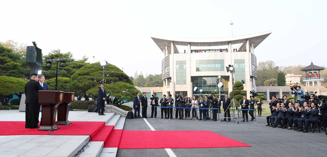 2018 남북정상회담이 열린 27일 오후 문재인 대통령과 김정은 국무위원장이 평화의 집 앞에서 판문점 선언을 낭독하고 있다.