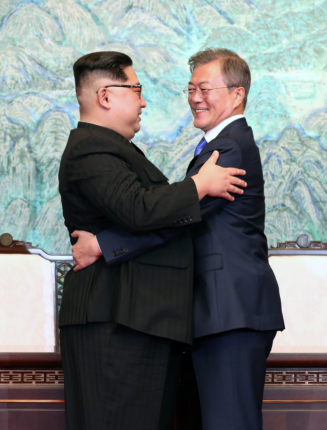 문재인 대통령과 김정은 국무위원장이 27일 오후 판문점 평화의 집에서 열린 남북정상회담에서 한반도의 평화와 번영, 통일을 위한 판문점 선언문에 서명 후 포옹 하고 있다.