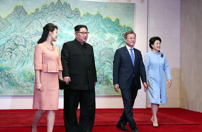 문재인 대통령 내외와 김정은 국무위원장 내외가 27일 오후 판문점 평화의 집에서 열린 남북정상회담 만찬에 앞서 기념 촬영후 이동 하고 있다.