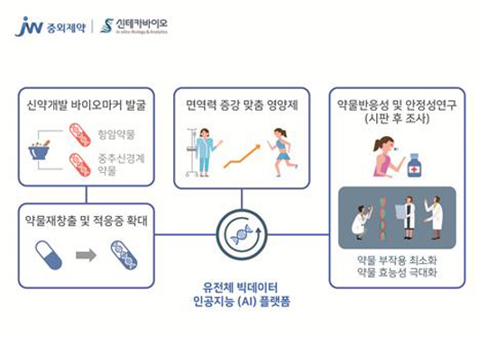 이번 협약에 따라 JW중외제약은 신테카바이오가 보유한 ‘개인 유전체 맵 플랫폼(PMAP)’의 약물 반응성 예측기술을 활용해 신약 후보물질의 바이오마커를 발굴하는 등 연구·개발의 효율성을 높인다는 방침이다.